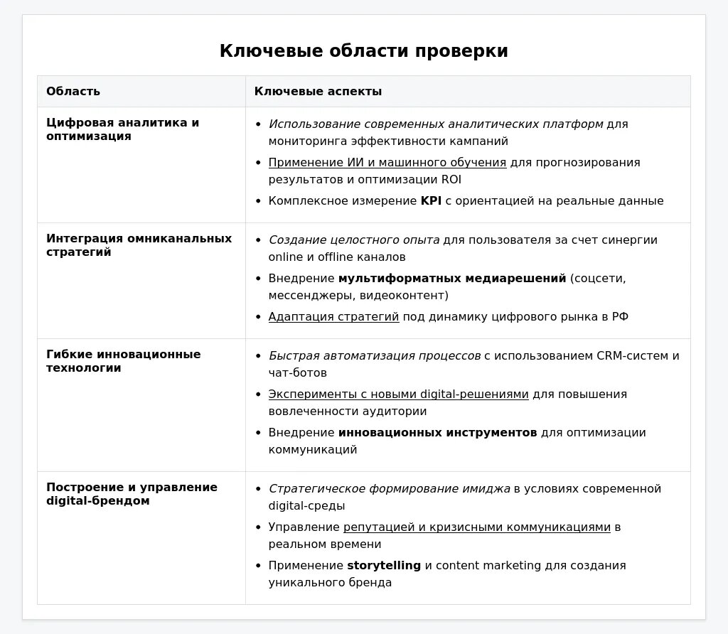 Области знаний 2025 года: Особое внимание уделяется Big Data, аналитическим платформам, искусственному интеллекту в маркетинге и цифровым инструментам для мониторинга эффективности кампаний.