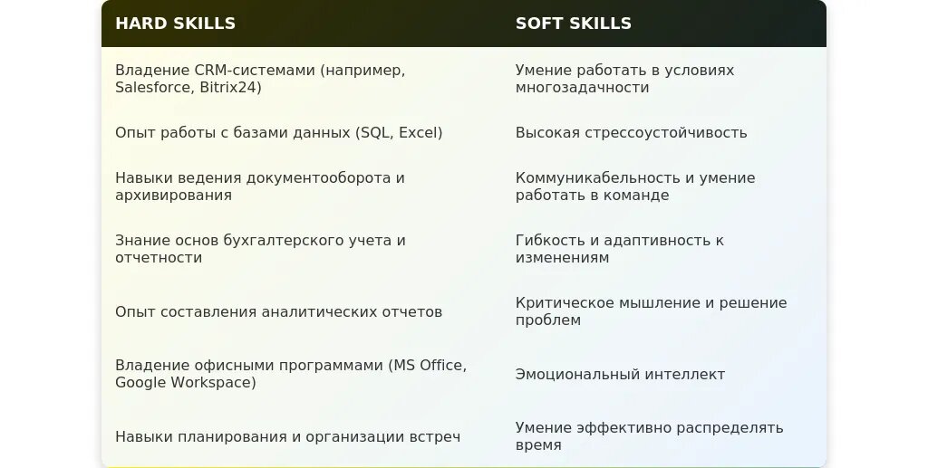 После адаптации: "Навыки работы с Microsoft Office, 1С:Документооборот, CRM-системами".