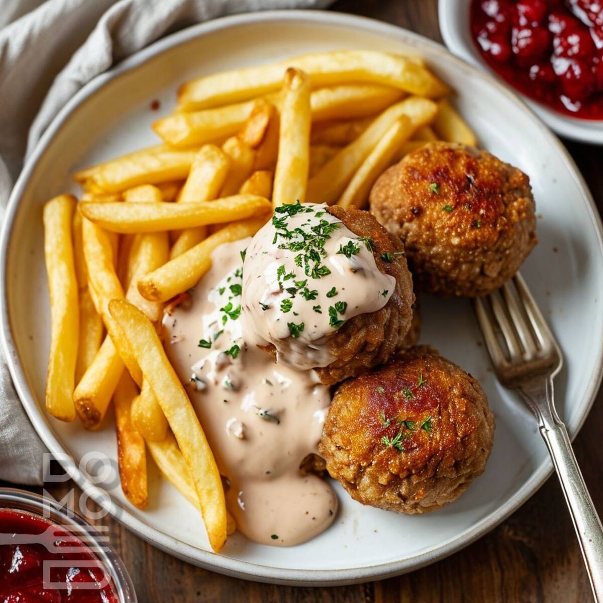 🍽️ ШВЕДСКИЕ ФРИКАДЕЛЬКИ (как в IKEA) Знаменитые скандинавские тефтельки с картофелем фри и ягодным соусом – вкус детства! ⏳ Время приготовления: 1 час 🍽 Порций: 5-6 (50-60 фрикаделек) 🔥 Калорийность: 400 ккал/порция 🛒 ИНГРЕДИЕНТЫ Для фрикаделек: • Фарш (говядина+свинина) – 500 г • Картофель отварной – 2 шт. (средние) • Лук – 1 шт. • Панировочные сухари – 50 г • Сливки 20% – 100 мл • Яйцо – 1 шт. • Сливочное масло – 30 г Для соуса: • Бульон – 200 мл • Сливки 20% – 200 мл • Соевый соус – 3 ст. л. • Мука – 1 ст. л. Для подачи: • Картофель фри – 500 г • Брусничный джем – 100 г 👩 ПОШАГОВЫЙ РЕЦЕПТ 1️⃣ Приготовление фрикаделек 1. Обжарьте лук на сливочном масле до прозрачности. 2. Разомните картофель в пюре → смешайте с фаршем, яйцом и специями. 3. Сформируйте шарики диаметром 3 см. 4. Обжарьте на среднем огне по 4 минуты с каждой стороны. 2️⃣ Сливочный соус 1. Смешайте сливки с мукой. 2. Влейте в кипящий бульон, добавьте соевый соус. 3. Варите 5 минут до загустения. 3️⃣ Картоф