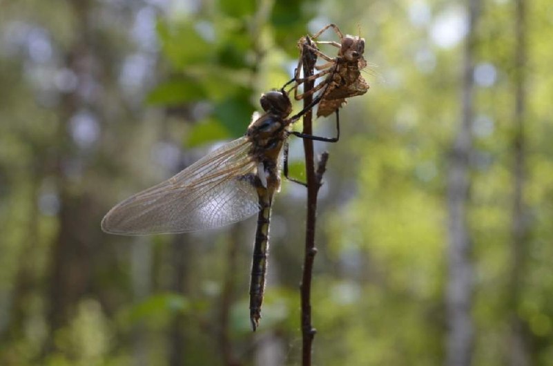В Саянах сфотографировали момент выхода самки стрекозы Бабки двупятнистой из шкурки личинки