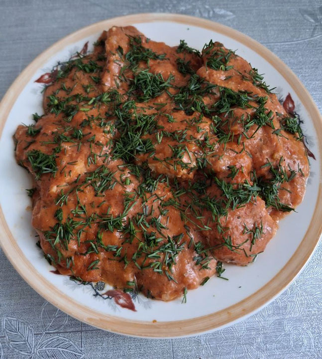 ✔ Рыба – 600 г (у меня – хек); ✔ Вода - ~1,2 л; ✔ Лавровый лист, душистый перец, соль. Рыбу вымыть, почистить, нарезать на кусочки. Кипящую в кастрюле воду посолить, добавить лавр, душистый перец. В кипящую воду выложить рыбу, дать закипеть и проварить 2-3 минуты. Выключить огонь, и приготовить заливку: ✔ 300 мл воды; ✔ Томатная паста – 1 ст. л. с горкой; ✔ 3/4 ч. л. соли; ✔ 1 ч. л. эритротола (для баланса вкуса); ✔1,5ч. л. псиллиума; ✔½ ст. л. лимонного сока; ✔Сметана – 1 ст. л. с горкой; ✔Натёртая цедра 1 лимона; ✔ 1 ч. л. сушёных трав (те, какие любите); ✔ немного сушеного лука и чеснока. Все смешала, вылила в сковороду и оставила закипать. Тем временем достала из кастрюли рыбу, выбрала все косточки. Когда в сковороде закипел соус, отправила туда рыбу, полила соусом там, где рыба выглядывает, накрыла крышкой и тушили на слабом огне 5-6 минут. Рыба получается нежная и вкусная. Примерное КБЖУ на 100 г - 59/10,8/1,1/1,2. Рецепт на странице Автор рецепта – Любовь Горбачёва Расчёт КБЖУ с