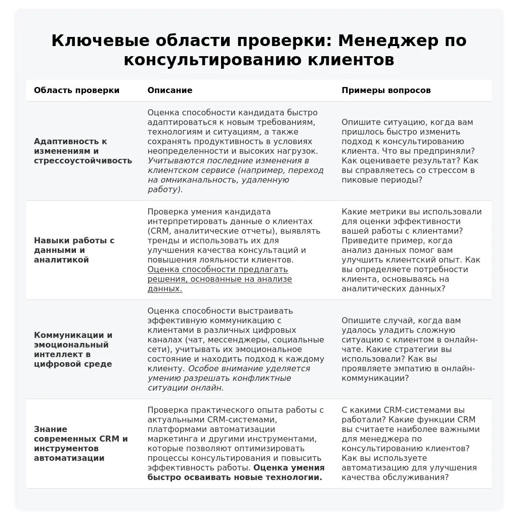 Пример: В крупной IT-компании при приеме на работу менеджера по консультированию клиентов могут потребовать знание основ программирования и опыт работы с CRM-системами. В небольшой консалтинговой фирме больше внимания уделят умению быстро обучаться и находить общий язык с разными типами клиентов.