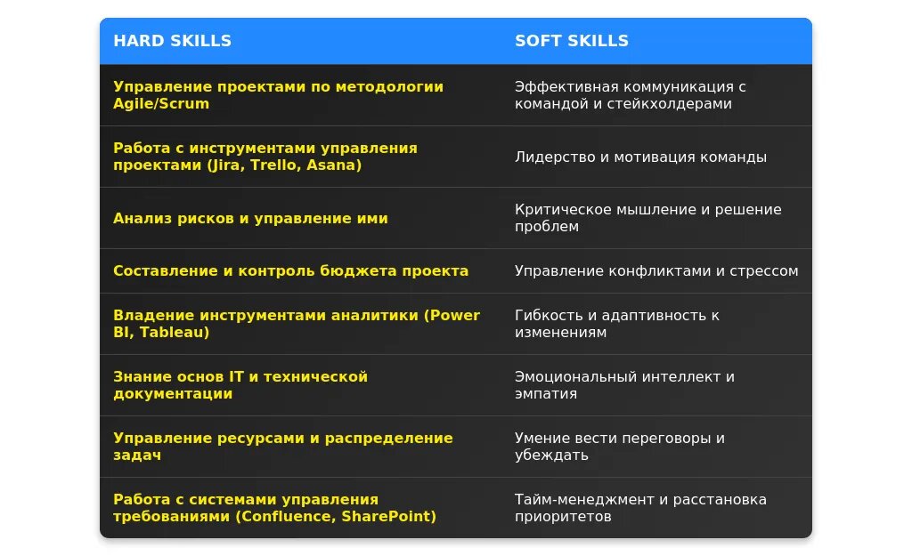 Обязательные hard skills включают управление проектами, бюджетирование, риск-менеджмент и знание инструментов, таких как MS Project, Jira, Trello. В 2025 году актуальны также навыки работы с AI-инструментами для анализа данных и автоматизации процессов.
