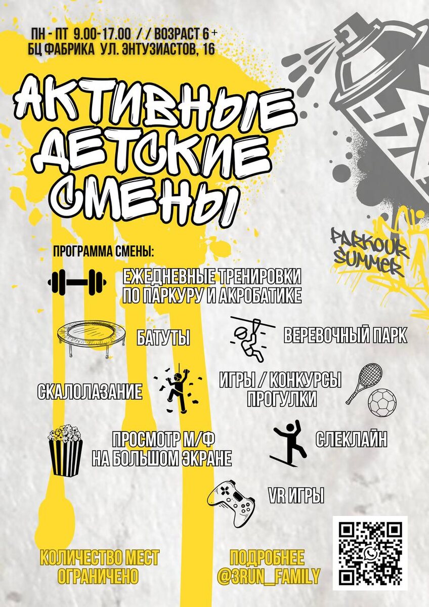 Летние каникулы с центром паркура и акробатики☀️ Возраст 6-12 лет; Пн-пт 9.00-17.00; ТЦ Глобус (Тольятти, 27А) | БЦ Фабрика (Энтузиастов, 16) Выбирай подходящую смену и записывайся ⬇️ ☀️2 — 6 июня ☀️9 — 20 июня ☀️23 июня — 4 июля ✅ Активный отдых – никаких скучных каникул! Ежедневные тренировки по паркуру и акробатике ✅ Развлечения на максимум – лабиринт, профессии, игровые автоматы в РЦ Крейзи Клаб, VR игры, боулинг, скалолазание, просмотр м/ф на большом экране ✅ Безопасность и комфорт – дети под присмотром опытных тренеров и вожатых с 9:00 до 17:00. ✅ Яркие эмоции и новые друзья – ваш ребенок точно не захочет уходить! Стоимость ⬇️ 1 день - 3000 5 дней - 12500 10 дней - 25000 Запись ⬇️ https://wa.me/message/R6R6N5NMSWCMN1 Для подписчиков «Скидки/Акции Новокузнецк» Скидка 2000 на полную смену #новокузнецк #скидкиновокузнецк