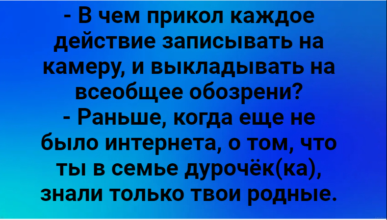 Да меня уже подобный контент начал раздражать. Все эти натянутые улыбки, наигранные эмоции… Вот интересно, как вобще эти люди жили раньше без записи каждого чиха на видео? Дошло уже до того, что выкладывают съёмки с похода в туалет в моментах выделения продуктов жизнедеятельности А как Вы относитесь к этому?