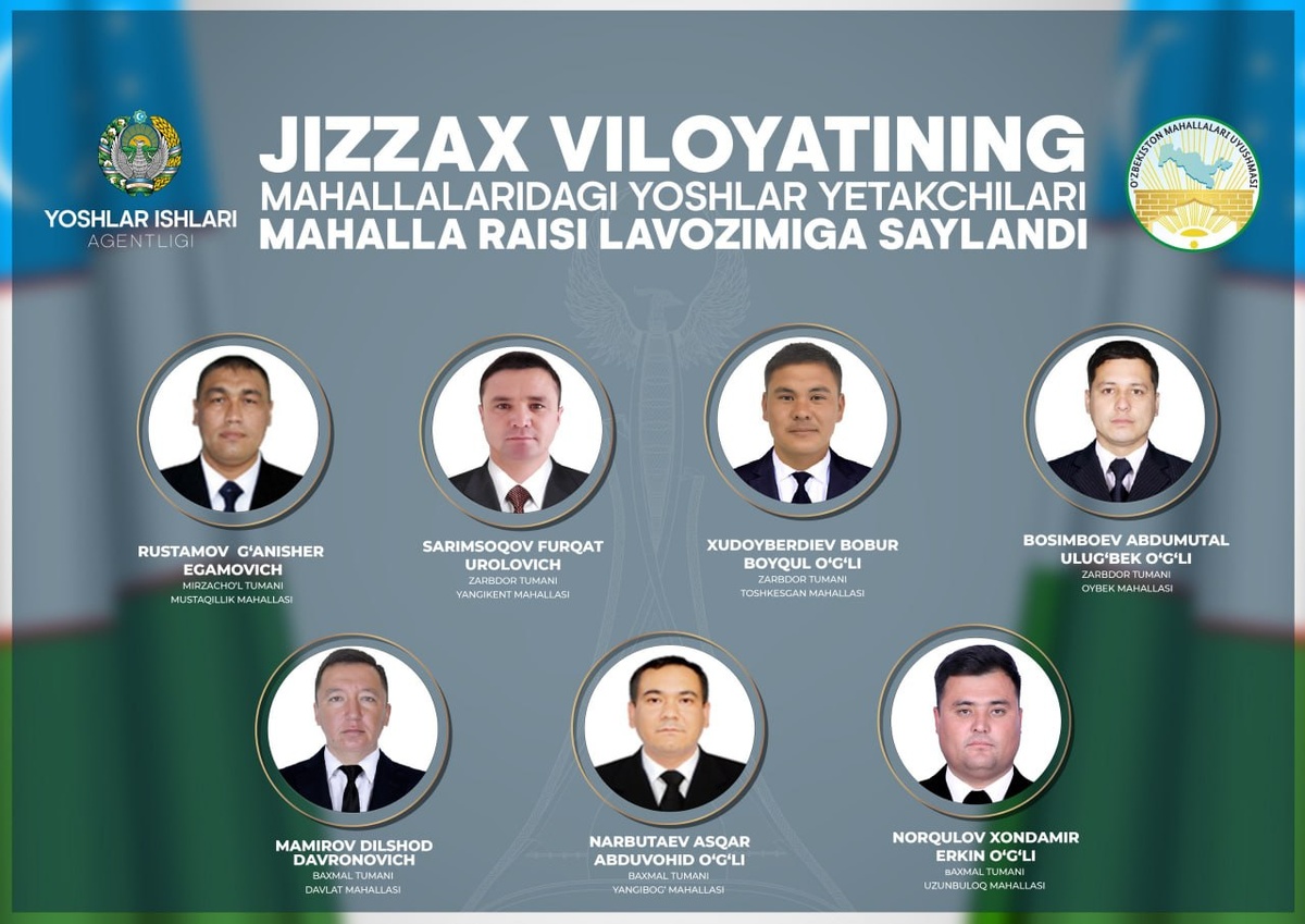 2025 йил май ойида Жиззах вилоятида ўтказилган маҳалла фуқаролар йиғини раислигига ўтказилган сайловларда ўз номзоди билан иштирок этган 7 нафар маҳалла ёшлар етакчилари кўпчилик овоз билан маҳалла раиси лавозимига сайланди.