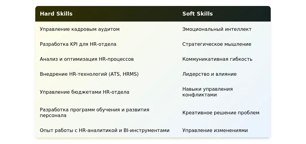 Перегруппируйте навыки, чтобы выделить требуемые компетенции. Например, если вакансия требует опыта работы с HR-системами, укажите конкретные программы: SAP HR, 1С:Зарплата и управление персоналом.