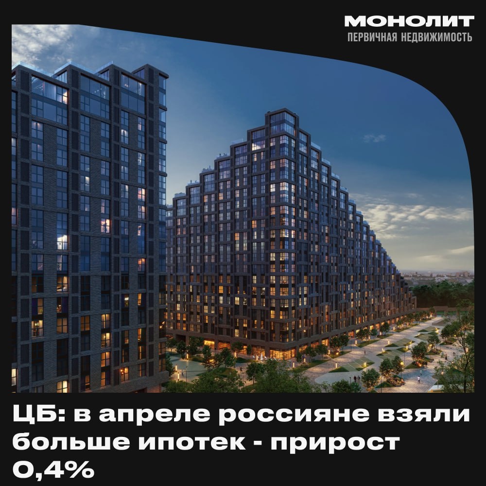 📊 ЦБ: ипотечное кредитование в России в апреле выросло на 0,4% после 0,2% в марте. В апреле в России продолжился рост ипотечного кредитования: по данным Центробанка, объем выданных ипотечных кредитов увеличился на 0,4%. Для сравнения, в марте этот показатель был ниже — всего 0,2%. Что касается суммы новых ипотек, то здесь тоже заметен рост: в апреле россияне оформили жилищных кредитов на ₽290 млрд, что на 13% больше, чем в марте (₽257 млрд). Интересно, что большая часть этих кредитов — около 85% — выдается по государственным программам поддержки. В апреле по таким программам россияне взяли ипотеку на ₽249 млрд, что на 11% больше по сравнению с мартом (224 млрд). В целом, спрос на ипотеку сохраняется высоким, и государственные программы остаются основным драйвером рынка. 🧊 Монолит
