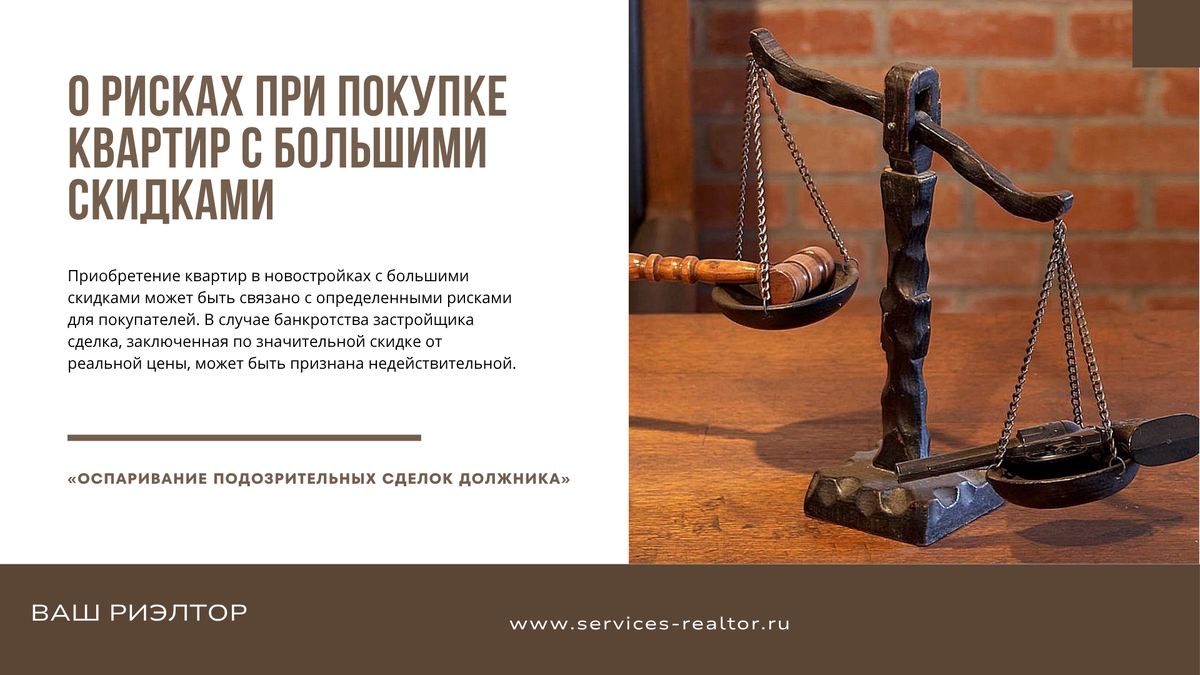 ◾Приобретение квартир в новостройках с большими скидками может быть связано с определенными рисками для покупателей. В случае банкротства застройщика сделка, заключенная по значительной скидке от реальной цены, может быть признана недействительной. ◾В условиях снижения спроса на новостройки застройщики начали активнее применять различные маркетинговые стратегии, такие как скидки и рассрочки, чтобы привлечь покупателей. На столичном рынке новостроек уже появились предложения с рекордными скидками в 55–60%. Однако такие большие скидки, если они действительно имеют место, а не являются уловками со стороны застройщиков, могут нести определенные риски. Какие именно угрозы могут подстерегать покупателей, приобретающих квартиры по существенно сниженным ценам? ◾При покупке квартиры в новостройке с значительной скидкой существует риск для покупателей. Если застройщик обанкротится в течение года, сделка может быть признана недействительной как подозрительная, поскольку она была совершена по неры