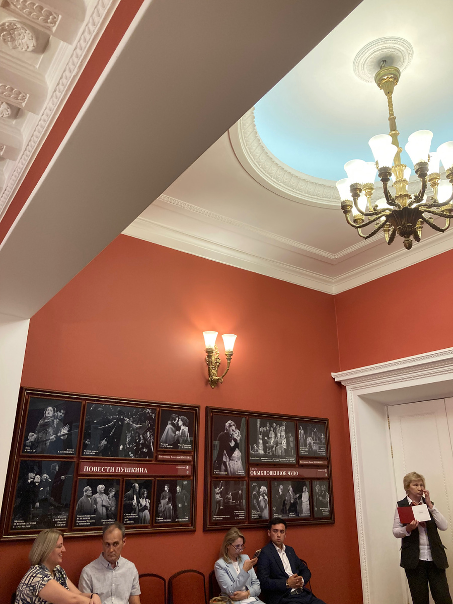 Сам театр, как музей.Все оказалось очень интересно. А еще мы поняли что давно не посещали театр . Очередь в буфет большая. Все покупают шампанское . А мы уже от очередей отвыкли, Но шампанского очень хотелось. Ну решили если что зайдем в какой-нибудь ресторанчик. Но мы даже и представить не могли , что закончится в12. А еще до дома сколько ехать. Хотели купить программку ,но нужны наличные. А у нас только карточка, узнали под самый конец, что можно оплатить QR-кодом. Много костюмов для разных спектаклей . В каждом уголочке продают шампанское . А это большой зал -буфет Шампанское с красной икрой. Места очень хорошие. А это мы😃 Вышли и уже темно. Очень красиво. Музей Пушкина. Ну вот и все.Потихоньку на метро добрались домой.