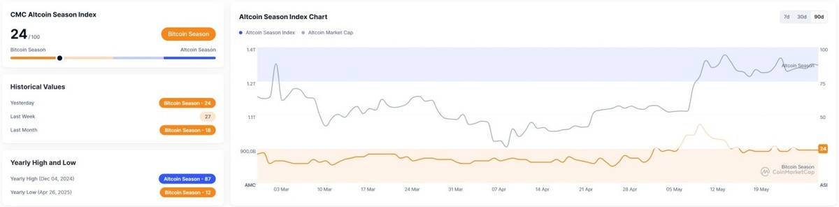 Индекс сезона альткоинов 24...на 1 пункт ниже, чем в предыдущий день