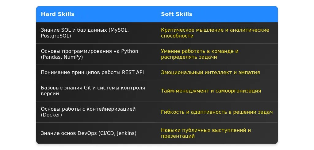- Навыки: Перечислите технические и soft skills, которые могут быть полезны.