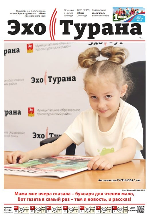 ВНИМАНИЕ! Уже завтра выходит очередной номер газеты «Эхо Турана». Читайте в свежем выпуске: ГЛАВНАЯ ТЕМА – реформа самоуправления в вопросах и ответах. ОБРАЗОВАНИЕ – итоги учебного года подводит заместитель директора Южного аграрного техникума Наталья ГРАБЛИНА. ГЕРОИ НАШЕГО ВРЕМЕНИ – с нашим корреспондентом побеседовал участник СВО Роман КНАУБ ИСТОРИЯ В ЛИЦАХ – 31 мая отмечает 90-летний юбилей подразделение по делам несовершеннолетних, рассказывает Галина Изюмская. НА ДОСУГЕ – детская страничка для самых маленьких и их родителей А ТАКЖЕ – новости короткой строкой о главных событиях недели, реклама, объявления и много другое… Спрашивайте газету в ближайших торговых точках!