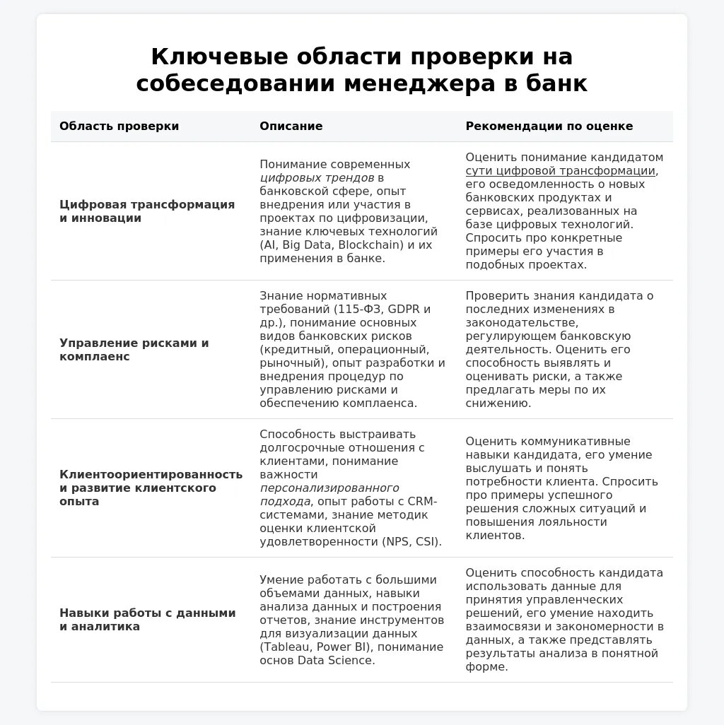 - Профессиональные знания и опыт: Оценивается понимание банковских продуктов, знание нормативных актов и опыт работы с клиентами.