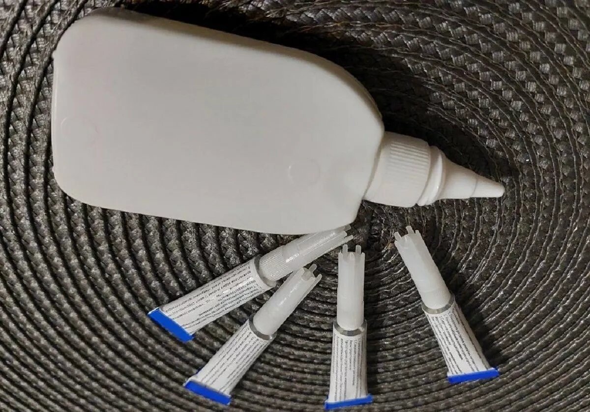 Ингредиенты перемешиваются в емкости и для удобства переливаются в небольшой пульверизатор. А после — разбрызгиваются на одну из деталей, которую нужно склеить. На второй детали, соответственно, нанесен клей.