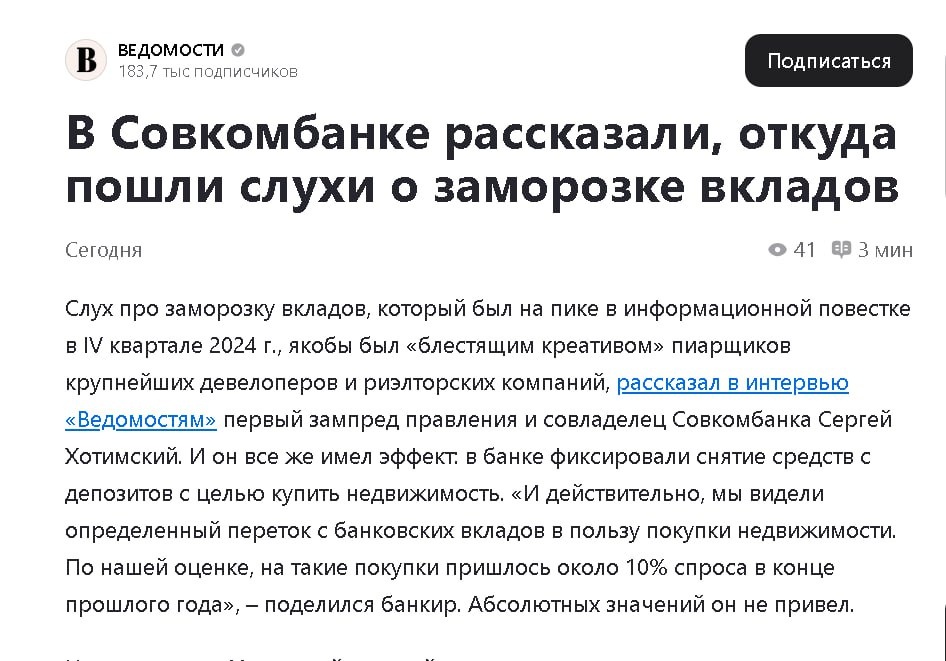 Спасибо форумчанам за наводку. Смешно. Цитата без купюр: Слух про заморозку вкладов, который был на пике в информационной повестке в IV квартале 2024 г., был «блестящим креативом» пиарщиков крупнейших девелоперов и риэлторских компаний, рассказал в интервью «Ведомостям» первый зампред правления и совладелец Совкомбанка Сергей Хотимский. И он все же имел эффект: в банке фиксировали снятие средств с депозитов с целью купить недвижимость. «И действительно, мы видели определенный переток с банковских вкладов в пользу покупки недвижимости. По нашей оценке, на такие покупки пришлось около 10% спроса в конце прошлого года», – поделился банкир. Абсолютных значений он не привел. ... Всё что нужно знать про записных «экспертов» и нашу прессу. Сначала они проводят блестящую спецоперацию, через полгода гордо делятся «секретом». Реально достали! Когда вы спотыкнётесь, на вас оттопчутся, исключительно ради удовольствия. 🕷