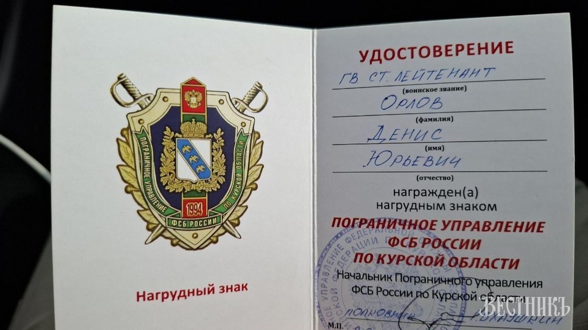 Денис Орлов получил нагрудный знак пограничника За совместную боевую работу в Курской области. https://orlvestnik.ru/news/denis-orlov-poluchil-nagrudnyj-znak-pogranichnika
