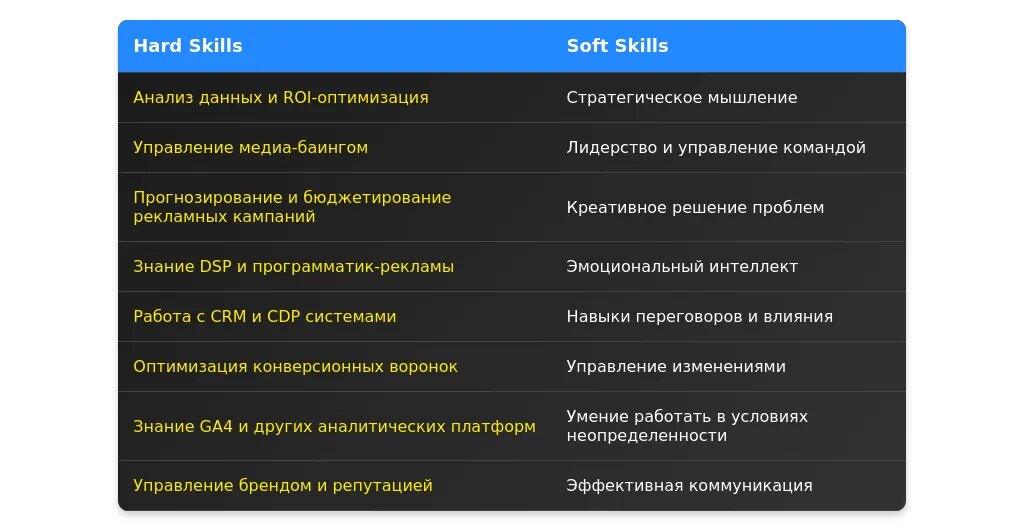 После: "Управление командой, аналитика рекламных кампаний, креативное мышление, работа с бюджетами."