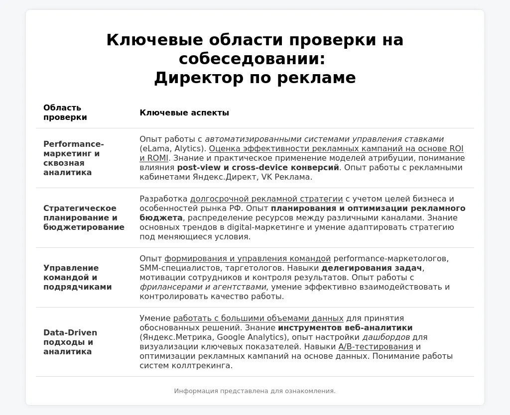 При отборе директоров по рекламе работодатели фокусируются на нескольких ключевых областях: