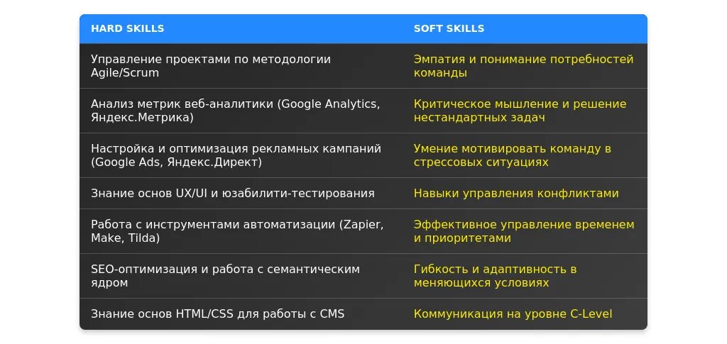 После адаптации: "Навыки: управление проектами, Google Analytics, работа с CRM, Agile-методологии."