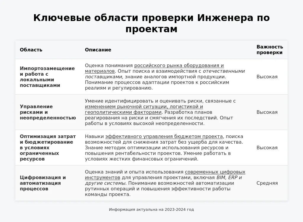 - Технические навыки: глубокое понимание принципов управления проектами, знание соответствующего ПО (MS Project, Jira, Trello и др.), умение читать техническую документацию и чертежи. Оценивается способность решать конкретные технические задачи, возникающие в процессе реализации проектов.