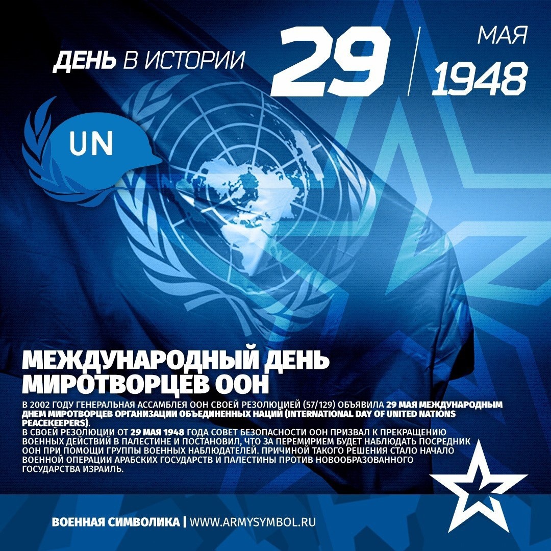 Международный день Миротворцев ООН В своей резолюции от 29 мая 1948 года Совет Безопасности призвал к прекращению военных действий в Палестине и постановил, что за перемирием будет наблюдать посредник ООН при помощи группы военных наблюдателей. Причиной такого решения стало начало военной операции арабских государств и Палестины против новообразованного Государства Израиль. Ранее Генеральная Ассамблея утвердила план раздела Палестины, предусматривавший создание арабского и еврейского государств и установление международного статуса для Иерусалима. Арабские государства с этим планом не согласились. Первая группа военных наблюдателей, получившая название «Орган Организации Объединенных Наций по наблюдению за выполнением условий перемирия» - ОНВУП, прибыла в регион в июне 1948 года. После распада СССР Российская Федерация на правах государства-правопреемника продолжила участие в миссиях Показать полностью... Подпишитесь на наши группы ВКонтакте и в Одноклассниках - читайте, смотрите и