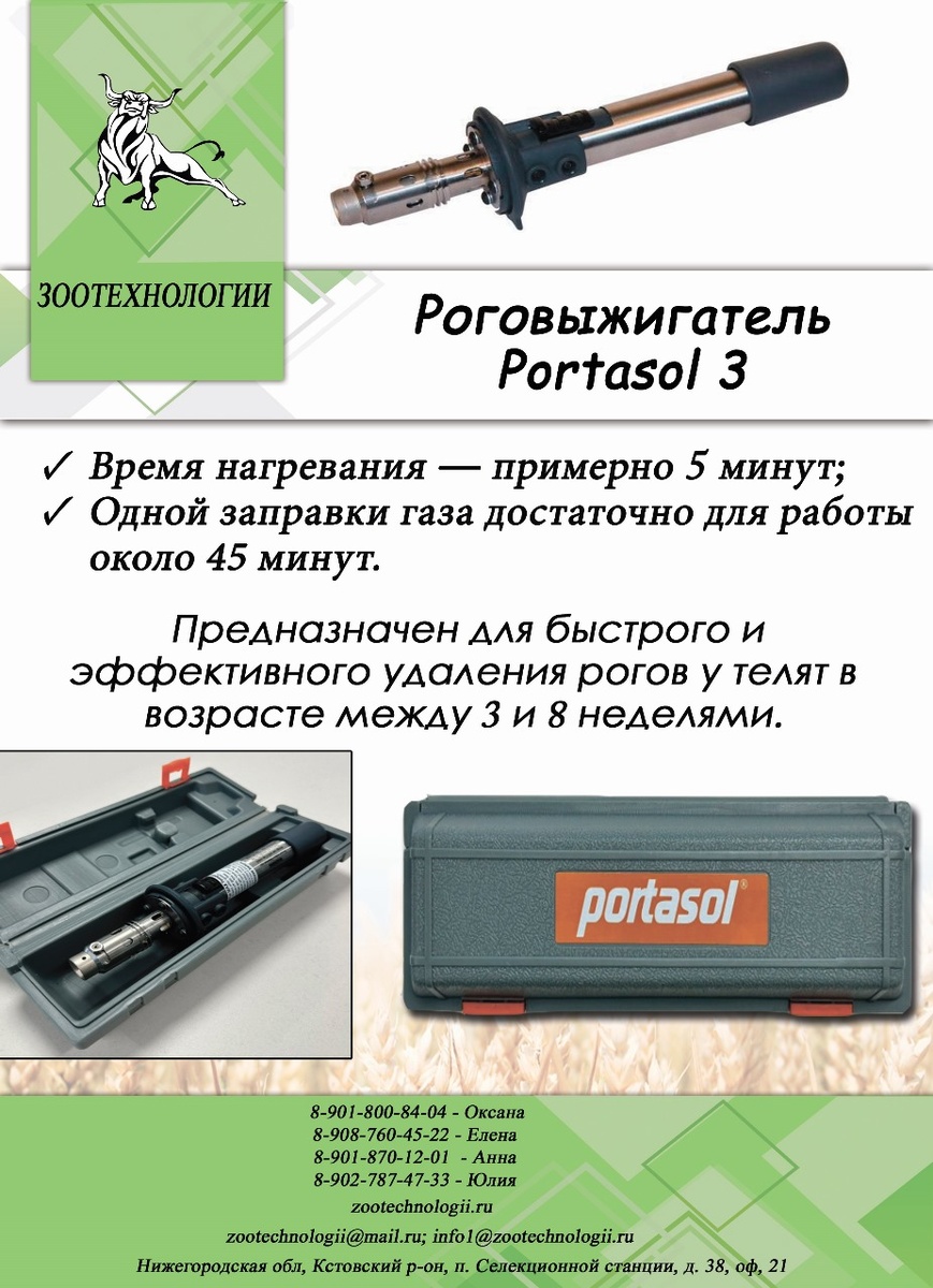 Добрый день. В продаже газовый роговыжигатель Portasol 3 с соплом диаметром 18,5 мм (производство — Польша), который предназначен для быстрого и эффективного удаления рогов у телят в возрасте от 3 до 8 недель. Устройство используется для предотвращения травм, которые могут возникнуть из-за столкновений рогами, например, в стойлах для беспривязного содержания скота. Роговыжигатель работает путём нагревания металлического наконечника до высокой температуры, что позволяет прожигать роговой слой и предотвращать рост новых рогов. Процесс обычно проводится в раннем возрасте, когда рога ещё мягкие и нежные, что делает его менее болезненным для животных. Важно: газ, на котором работает устройство, не входит в комплект поставки. Использовать роговыжигатель рекомендуется только в хорошо проветриваемом помещении. Оставить заявку можно у наших менеджеров: Оксана: 8-901-800-84-04 Елена : 8-908-760-45-22 Анна: 8-901-870-12-01 Юли