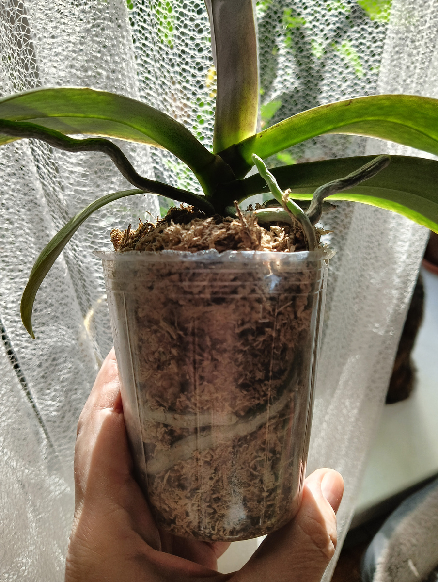 Третья моя малышка, приехала 24 мая. Эту точно не буду пока пересаживать, мох неплотный. Полила на третий день 50 мл, всё выпила, корни недозеленени, видать, не хватило на следующий день ещё столько же долила. Через низ, разумеется) И корни воздушные уже имеет. Обещают, что ароматная.