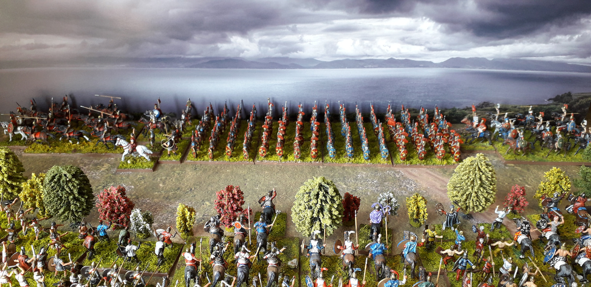 Выждав, пока римские войска растянутся вдоль берега Тразименского озера, Ганнибал дал сигнал к атаке и кавалерия и тяжёлая пехота обрушились на врага. Слева-направо на фото: иберийская пехота, африканская пехота, испанская кавалерия, карфагенская кавалерия, кельтская пехота, гальская кавалерия.