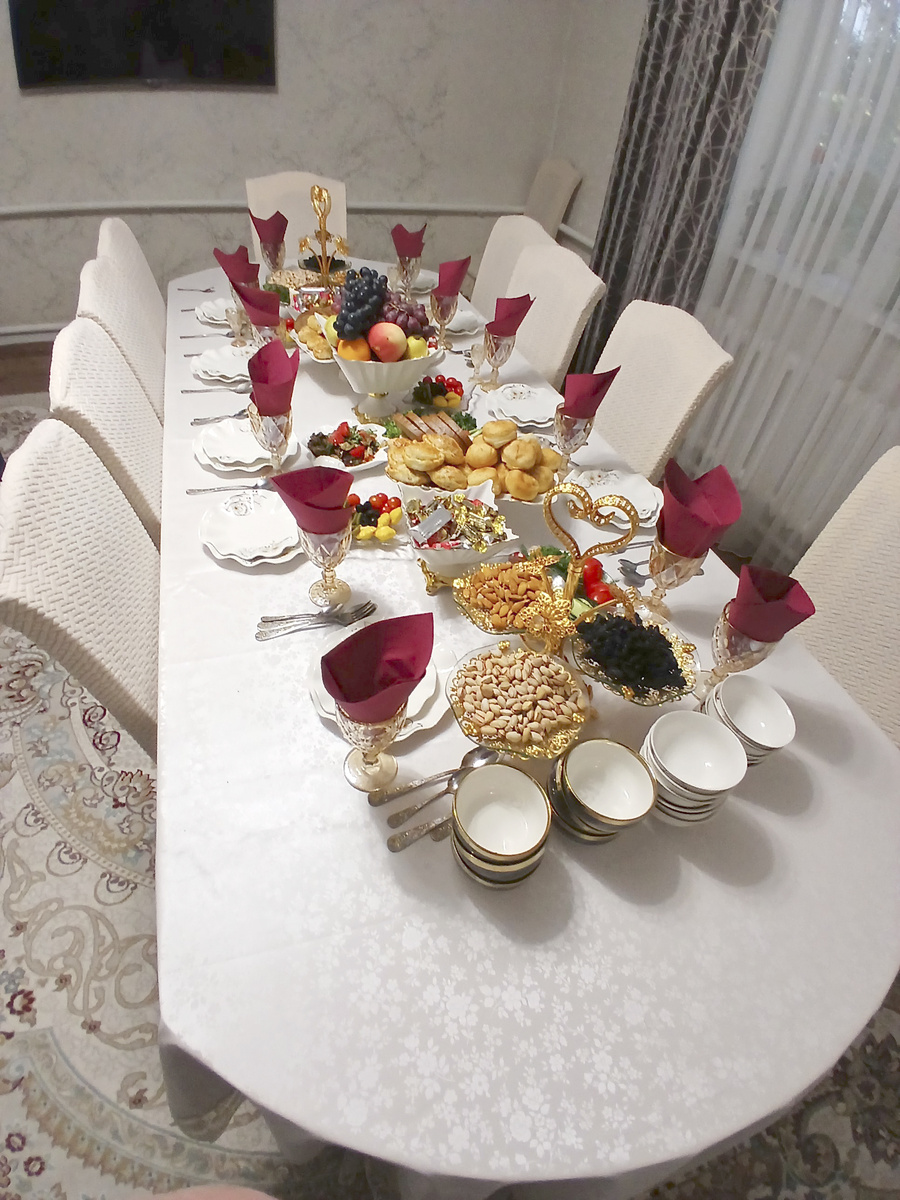 Доброго дня! В Казахстан я ездил в гости к своему другу. Он из большой семьи и нас, а в гостях ещё была пара из Беларуси, пригласили в гости к его родственникам. Я ожидал, что будет радушный приём, но чтобы настолько! Собрались его сёстры, племянники и другие родственники, которые были в тот момент в городе. Был накрыт шикарный стол! Гостей, по их обычаям, сажают в дальнюю от входа часть стола. Хозяева усаживаются на противоположный край. Я не буду перечислять всё, что было на столе, просто посмотрите фото: как всё красиво накрыто! Общались, рассказывали свои истории, говорили тосты за гостей, хозяев, детей. Потом пели песни: русские, казахские, белорусские. Спели и «День Победы», наш визит состоялся в майские праздники. Конечно, главными на столе были традиционные казахские блюда: манты и бешбармак. Подавались они на больших деревянных подносах – астау. За столом, по традиции, ухаживает за всеми жена сына – невестка. Приносит блюда, столовые приборы, разливает в пиалы чай. Потом в
