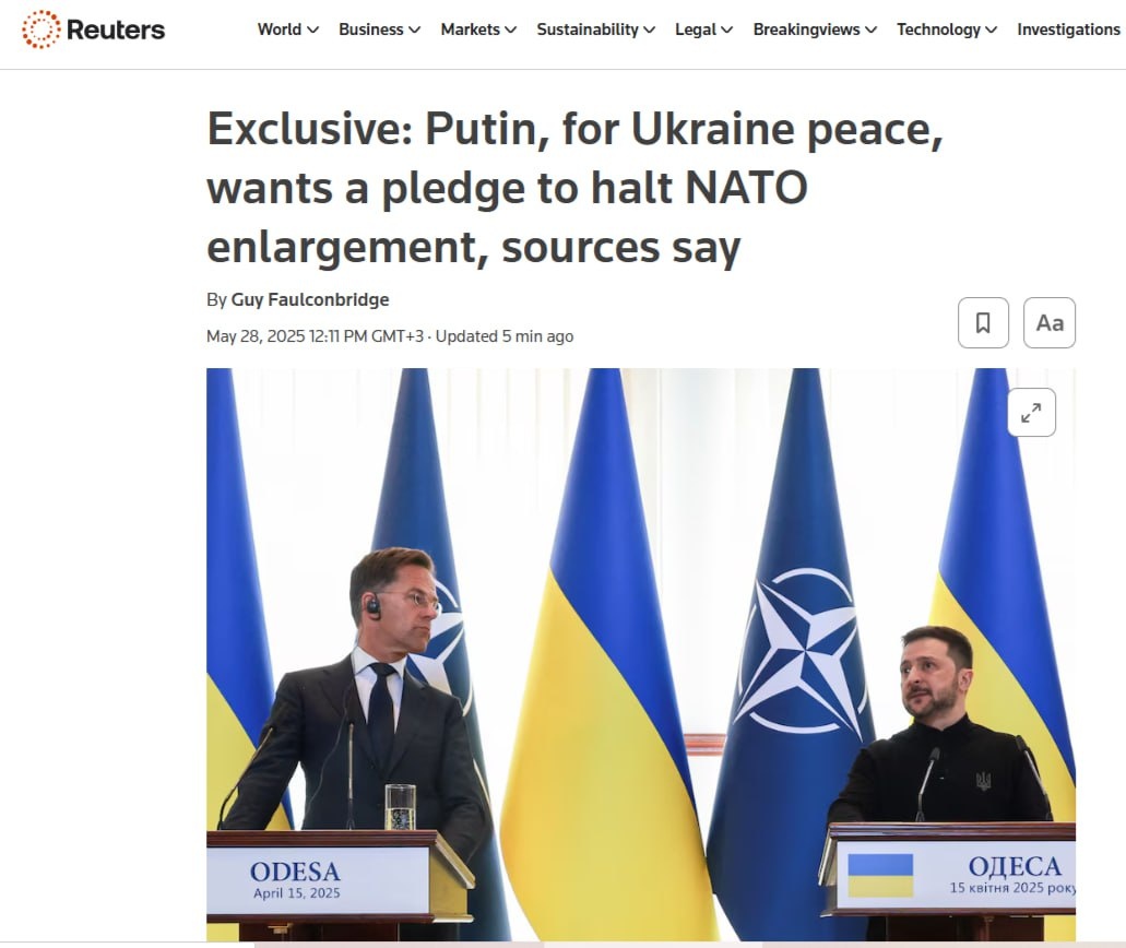 Новости хорошие: теперь мы знаем, почему мирные планы дядюшки Трампа сорвались 🤨 Путин ради мира на Украине хочет получить обещание остановить расширение НАТО, сообщают источники, - вчерашний эксклюзив от Reuters МОСКВА, 28 мая (Рейтерc) — Согласно трём российским источникам, знакомым с ходом переговоров, условия президента Владимира Путина для прекращения войны в Украине включают требование, чтобы западные лидеры письменно обязались прекратить расширение НАТО на восток и частично снять санкции с России. После более чем двухчасового разговора с Трампом на прошлой неделе Путин заявил, что он согласился работать с Украиной над меморандумом, который определит контуры мирного соглашения, включая сроки прекращения огня. Россия заявляет, что в настоящее время разрабатывает свою версию меморандума и не может оценить, сколько времени это займёт. «Путин готов заключить мир, но не любой ценой», — заявил один высокопоставленный российский источник, знакомый с мыслями Кремля на высшем уровне,