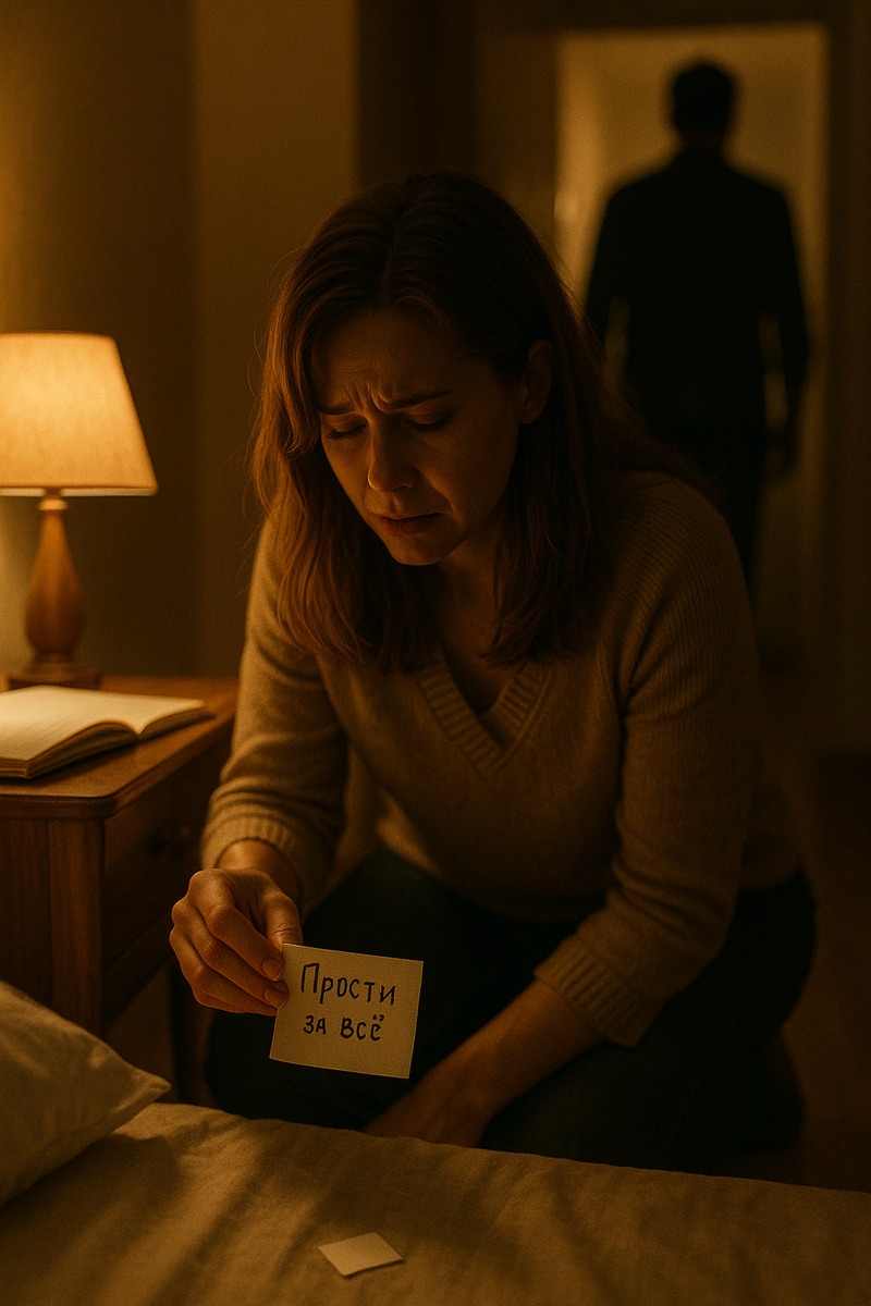 Тонкая записка выскользнула из блокнота и упала на ковёр. Марина приоткрыла глаза: луч света с улицы скользнул в щель занавески и сорвался прямо на квадратик бумаги. Пальцы сами потянулись: «Прости за всё». Две строки — почерк мужа, уверенный, знакомый, даже скромно красивый. Слова выгрызли дыру в груди.