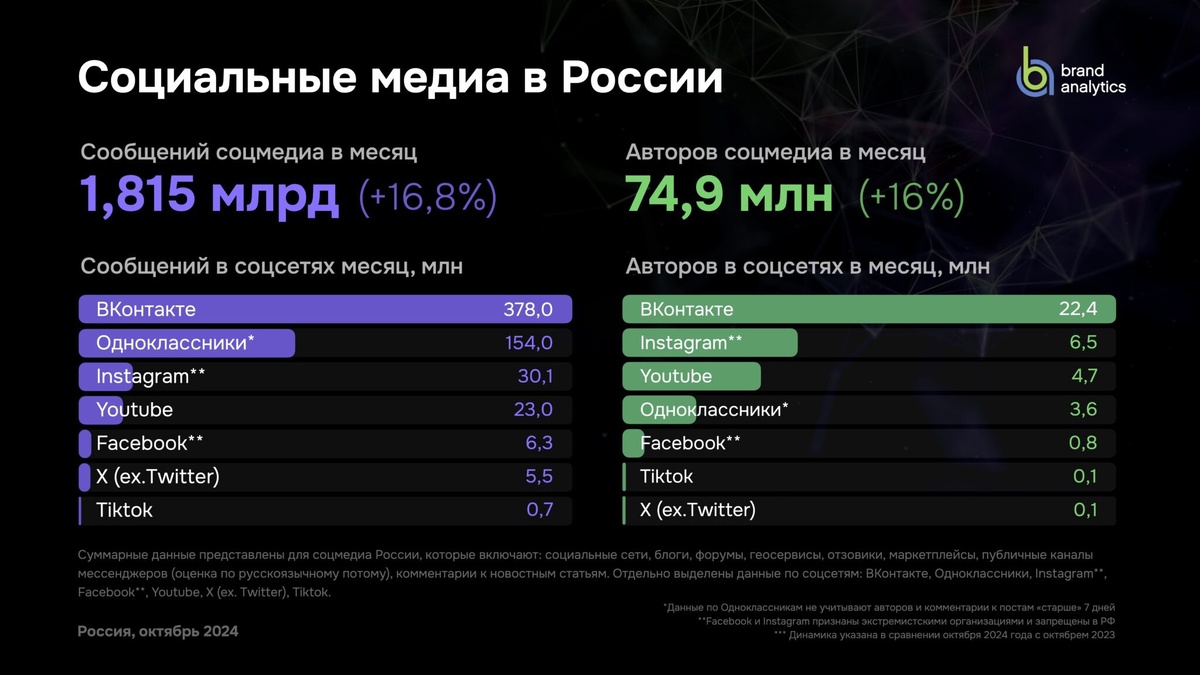 Пока вы листаете ленту в поисках очередного мемчика, социальные сети России переживают настоящий бум. Согласно исследованию Brand Analytics за октябрь 2024 года, число активных авторов достигло рекордных 74,9 миллиона, а объем контента вырос на 16,8%, составив 1,815 миллиарда сообщений. Особенно выделился Telegram, увеличив число активных авторов на 72% и объем сообщений на 19%. Однако не все так радужно: 42% контента в Telegram — это спам. "ВКонтакте" сохраняет лидерство по числу активных авторов и объему контента. Средний пользователь публикует 16,9 сообщений в месяц. Площадки с отзывами, особенно маркетплейсы, показали рост: +126% авторов и +292% сообщений. Таким образом, социальные сети в России продолжают развиваться, предоставляя новые возможности и для авторов и для потребителей контента.. #каналTelegram