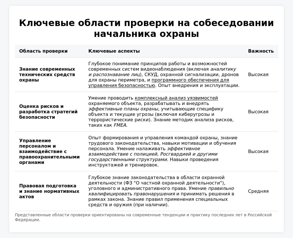 Собеседование на должность начальника охраны – это ответственный этап, где оцениваются не только ваши профессиональные навыки, но и личные качества, умение принимать решения в стрессовых ситуациях и знание нормативной базы.