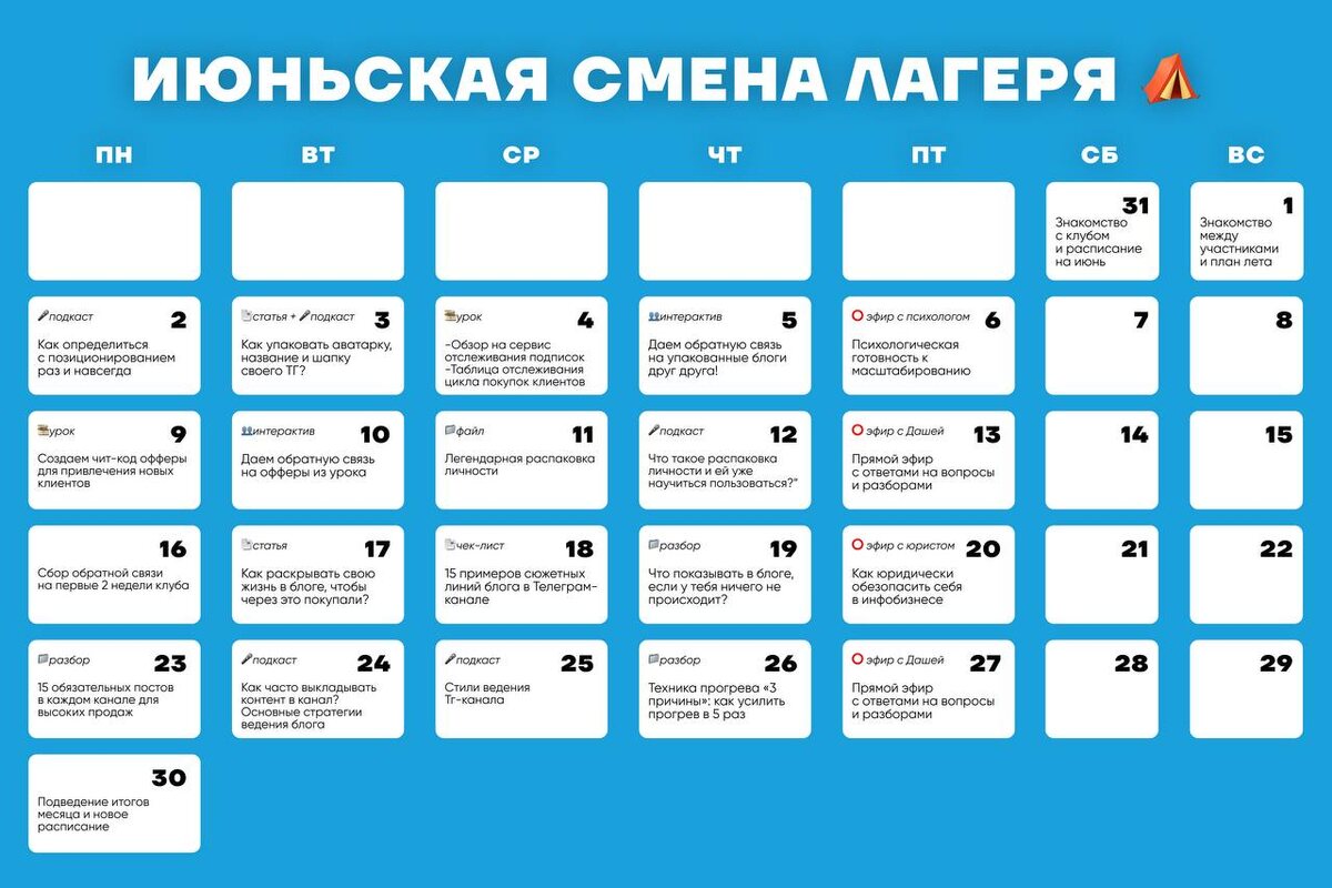 Первые 3 месяца клуба мы посвятим летнему лагерю по Телеграм. Что тебя ждет: