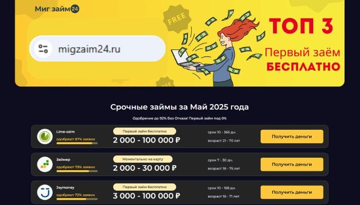 - Миг займ - Сайт migzaim24.ru представляет собой онлайн витрину, предлагающую услуги микрокредитных компаний (МКК).