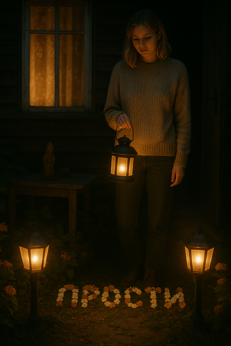 Солнце ещё не угасло, как фонари вспыхнули. Ирина решилась: берёт фонарик-блин, кухонный нож, куртку. Выскочила, подняла свет — и наткнулась на фигуру в парке возле сарая.