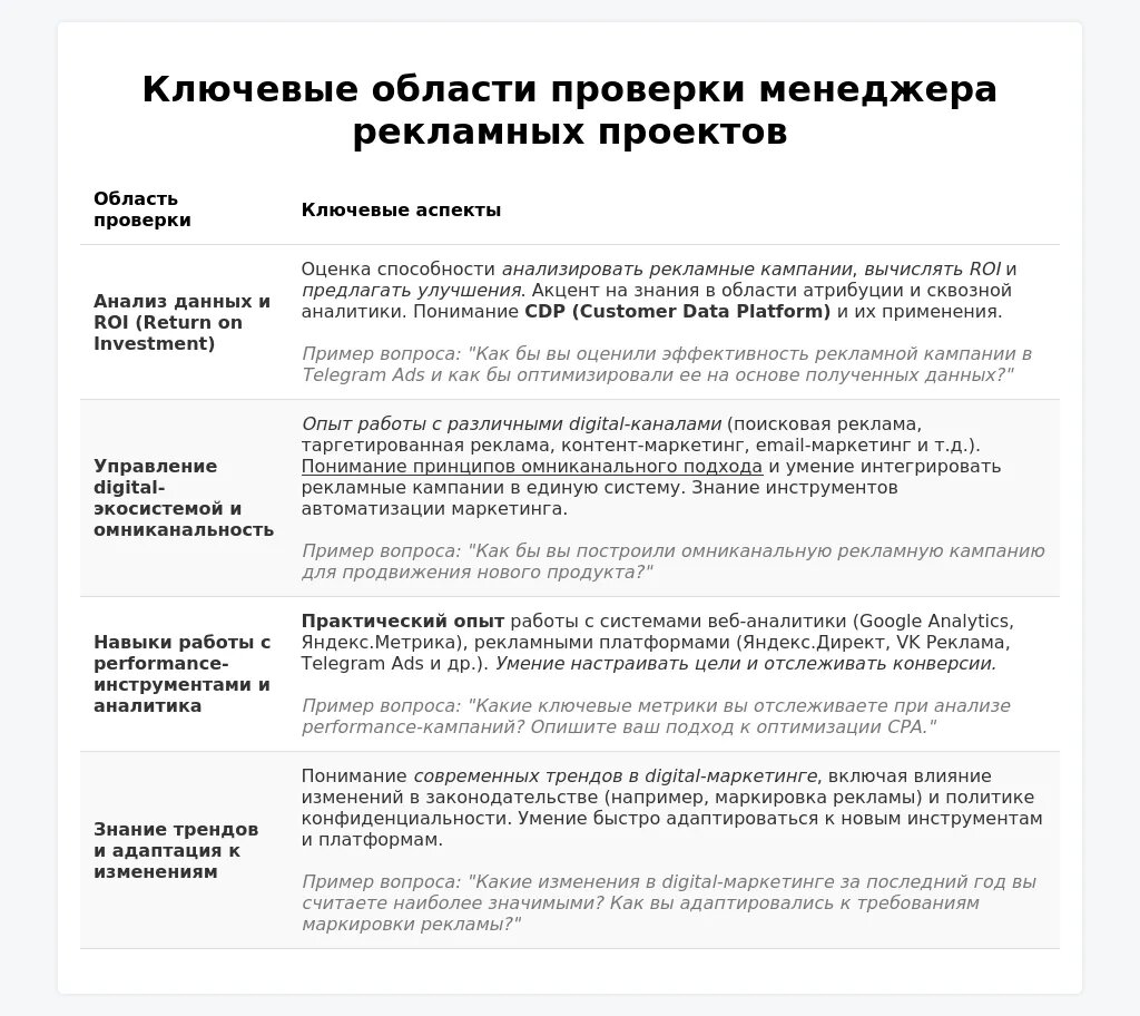 Умение убеждать, аргументировать свою точку зрения и находить компромиссы – критически важно. - Знание рекламного рынка и трендов:Оценивается понимание современных тенденций в рекламе, знание инструментов и платформ.