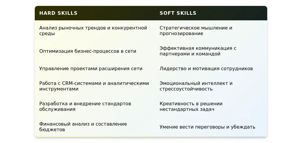 После: "Навыки развития сети, анализ рынка, увеличение продаж."