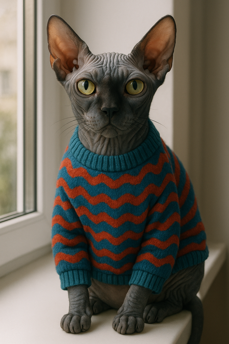 — А можно сделать из фото… картину? Но не просто картину, а чтобы — как будто это момент из книжки, которой никогда не было. Чтобы было видно: у него есть характер. Свой. Настоящий, — попросила девушка. — У кого? — уточнили мы. — У моего кота. Он Сфинкс. Он холоден только на ощупь. А внутри — кипяток с молоком и странностями. Он пьёт из моей чашки. Смотрит сериалы. И кажется, однажды просто уйдёт — если мы не напишем о нём историю. 📸 На фото — кот, будто сошедший с магической афиши. В полосатом свитере, с глазами, в которых космос и лёгкая претензия к миру. Сидит на подоконнике, как профессор. Или как воришка тайн. Не мяукает — сообщает. 👩 — Я говорю всем: он не питомец. Он — сосед по дому. Мы заключили договор: я не трогаю его еду, он не трогает мои мысли. Но иногда он заглядывает в них, будто в коробку с сушёными шишками. И молчит. 🎨 На картине: