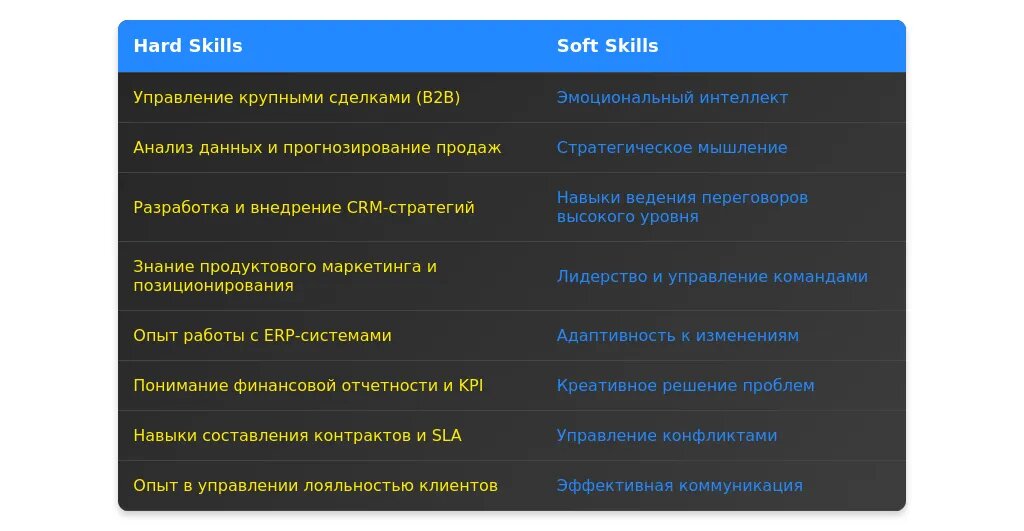 Навыки нужно перегруппировать так, чтобы они соответствовали требованиям вакансии. Выделите ключевые компетенции, такие как управление командой, работа с CRM-системами и стратегическое планирование.