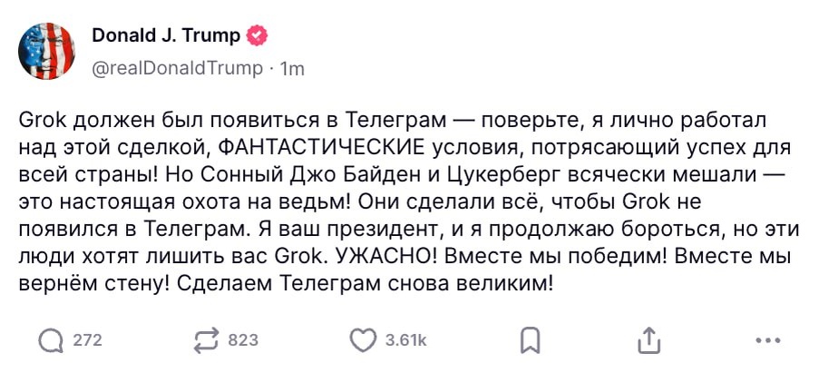 ⚡️ Трамп срочно включился в сделку по Grok в Телеграм.