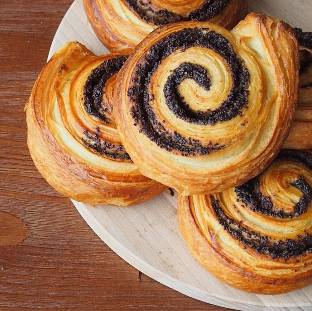 🍜 Домашние булочки с маком ⠀ 📌 Ингредиенты: Слоеное тесто - 500 г. Мак - 1 стакан Кипяток - 1 стакан Белок - 1 шт. Желток+1 ч.л.молока - для смазывания Сахар - 0,5 стакана Изюм - 100 г. ⠀ 🔪 Приготовление: 1. Пока тесто размораживается, мак залить крутым кипятком и оставить для набухания. Промыть и замочить изюм. 2. После того, как тесто разморозится — немного раскатать его или растянуть руками. 3. Взбить белок и сахар, добавить процеженный мак и размешать. Эту смесь нанести на тесто, посыпать изюмом и, если любите по слаще, добавить немного сахара. 4. Свернуть рулет, разрезать на небольшие кусочки, дать немного постоять. Затем смазать желтком, смешав его с молоком и посыпать немного маком. 5. Выложить булочки на противень, застеленный пекарской бумагой и поставить, разогрев духовку до 180 градусов на 15-18 минут. Приятного аппетита 😋