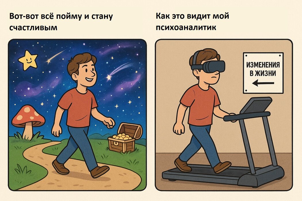 Результат: ко мне обращаются подкованные в теориях и исчерпывающе информированные люди с запросом: «Я уже во всем разобрался, но ничего не меняется, скажите что дальше делать!» Ирония в том, что психоанализ – это не про «дальше». Это про иначе. Понимание живёт в сознании. А причина симптома – в бессознательном.