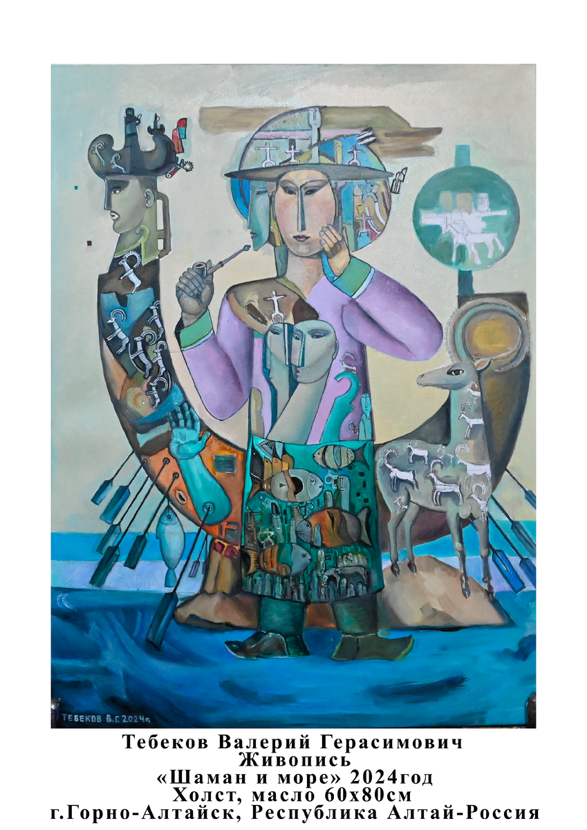 Тебековский изобразительный стиль, выбирающий театральную интерпретацию, позволяет разгуляться автору в творческих затеях. Можно все, но эта свобода сопряжена с проявлением выверенного, точного, весьма искушенного собственной живописной и сценографической историей – авторского вкуса. Потому, например, сюжет «Алтайка с трубкой» – это воплощение какого-то видения женщины, чья красота стремится к утонченности, чей образ мог бы напомнить чеховских героинь. Она сидит не возле очага с прокопченным от горного солнца лицом, а в каком-то космическом пространстве, нежная и прекрасная, и этническое выведено из-за кулис и как-то спокойно расположилось там, где ему показалось удобным.