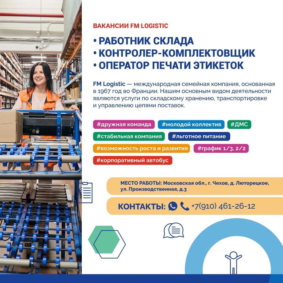 Приглашаем в команду FM Logistic! Можно без опыта✨ ⭐Работник склада – от 81 760 руб. до вычета НДФЛ, работы по комплектовке товаров, сборке, упаковка, стикеровка, размещение товара, работа с компьютером и документами на элементарном уровне ⭐Контролер-комплектовщик на участок упаковки косметики – от 81 760 руб. до вычета НДФЛ, обеспечение работой линии, запуск, подготовка образца, контроль, оформление актов, контроль работы персонала подрядчиков ⭐Оператор печати этикеток – от 72 000 руб. до вычета НДФЛ, работа с документацией и орг. техникой, взаимодействие с водителями. Мы предлагаем: ✅ Официальное трудоустройство ✅ Белая заработная плата, выплаты 2 раза в месяц ✅ Штрафов НЕТ! ✅ Выплата сверхурочных по итогам месяца ✅ График сменный: 2/2 (дневные и ночные смены) или 1/3 ✅ БЕСПЛАТНО: обучение на технике, спец. одежда и обувь, ДМС со стоматологией, ДМС на детей до 17 лет ✅Льготное питание ✅ Корпоративный транспорт ✅ Премия к Акции «Приведи друга!» - 15 000 руб. ✅ Скидки от партнеров Т