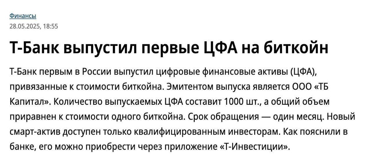 🪙🇷🇺 Т-БАНК ЗАПУСТИЛ ЦФА НА BTC (БИТКОИН) Один ЦФА приравнивается к 0,001 биткойна. Заработать можно не только на движении курса самого битка, но и на колебаниях рубля — расчёты идут в долларах, а актив торгуется в рублях. Инструмент уже доступен в приложении Т-Инвестиций — только для квалифицированных инвесторов.