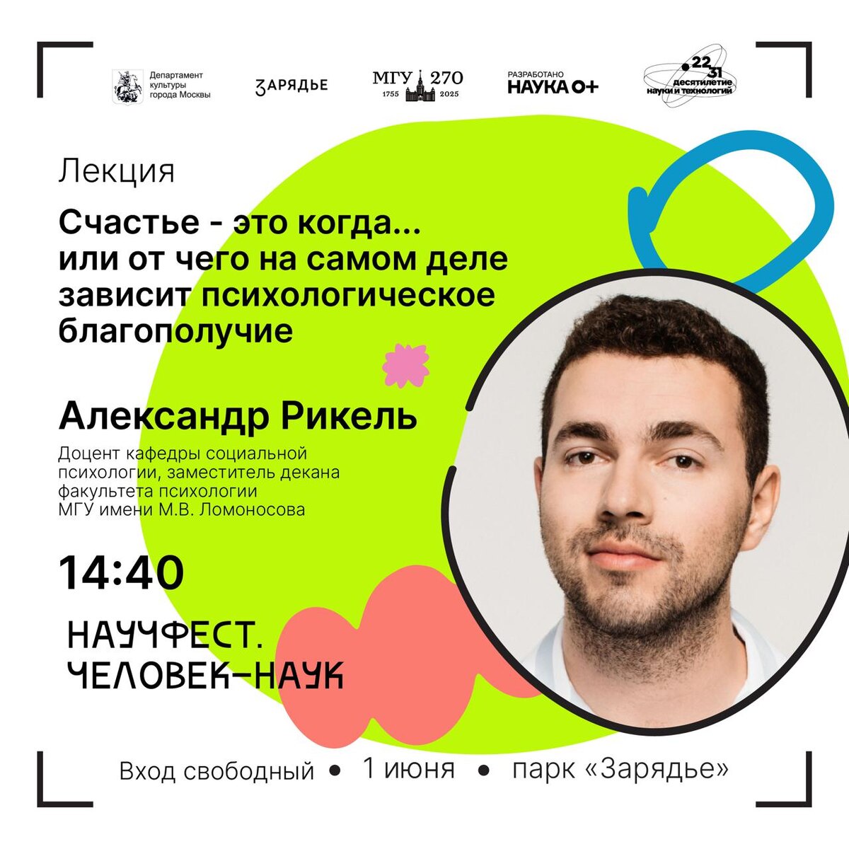 Счастье под микроскопом: научный взгляд на психологическое благополучие 1 июня в 14:40 доцент кафедры социальной психологии МГУ имени М.В. Ломоносова Александр Рикель расскажет, от чего на самом деле зависит наше счастье. Лекция «Счастье — это когда... или от чего на самом деле зависит психологическое благополучие» поможет разобраться в стереотипах и мифах о счастье, а также узнать о последних научных исследованиях в этой области. Мероприятие состоится в зоне НеЛектория фестиваля «НАУЧФЕСТ. Человек-наук» в парке «Зарядье». ➡️Вход свободный! Смотрите полную программу мероприятий на сайте. ❤️ Для тех, кто не сможет посетить фестиваль лично, будет организована онлайн-трансляция на платформе VK Видео по ссылке. #анонс #НаучФест