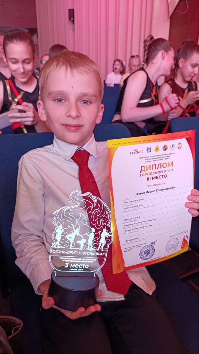 Друзья, у нас отличные новости! 🎉Под руководством классного руководителя Липницкой Екатерины Викторовны наша Августина Р. стала Победителем городского этапа конкурса-смотра "Огонь — друг, огонь — враг" и заняла 1 место в номинации "Фото"! 📸 А Михаил Ф. занял почётное 3 место в номинации "Кино-видео творчество"! 🎬 27 мая в методическом центре состоялся Гала-концерт с награждением победителей, где Михаил лично получил заслуженные награды за себя и одноклассницу. Гордимся нашими талантами и поздравляем ребят с яркой победой! 🏆 Желаем новых идей, вдохновения, интересных работ и дальнейших успехов! Вы — наша гордость! ✨ #Школа113 #ДОНМ #ТалантливыеДетиМосквы