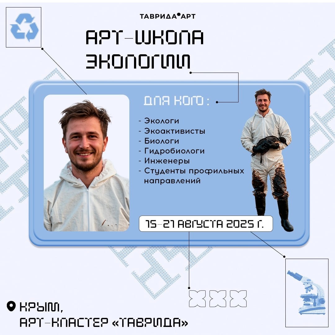 Продолжается подача заявок на летнюю школу арт-кластера «Таврида» 🚀 Седьмая Летняя школа пройдёт с 15 по 21 августа. Работа арт-школы экологии, созданной для молодых учёных, экологов, биологов и экоактивистов, будет направлена на осмысление проблемы, возникшей в Чёрном море после разлива мазута в Керченском проливе в декабре 2024 года. В рамках арт-школы участники займутся разработкой проектов по предупреждению и предотвращению последствий экологических катастроф в водах Чёрного моря, а также составят методическое пособие по предотвращению и ликвидации последствий подобных ситуаций в будущем. Ключевыми партнёрами арт-школы станут: ППК «Российский экологический оператор» и движение «Экосистема». Регистрация доступна до 5 июля по ссылке 👉 clck.ru/3LUKGh